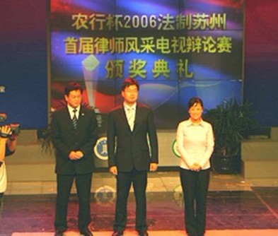 11月3日,在苏州市律师风采电视辩论赛颁奖仪式事务所顾海啸律师获得最佳法理奖。中共苏州市委常委、宣传部长徐国强、市委常委、市政法委书记邱岭梅、市司法局局长陈顺余、市广电总台台长瞿长林等领导出席本次辩论赛的颁奖仪式并为获奖律师颁奖。自此,由苏州市律师协会和市广电总台联合承办的“农行杯”2006苏州律师风采电视辩论赛圆满落幕。 本次比赛自10月初开始以来,历经初赛、复赛和决赛,来自全市的24名律师辩手围绕当前老百姓日常生活中经常遭遇的法律问题展开深入的讨论,参赛律师在广大电视观众面前彰显苏州当代律师的精神面貌。