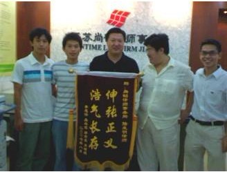 2007年8月23日上午,四名外来务工人员从外地专程来到我们事务所,为陆律师成功通过调解方式,为他们要回一年的务工工资,特意向事务所陆发明律师表示感谢,并献上锦旗一面。