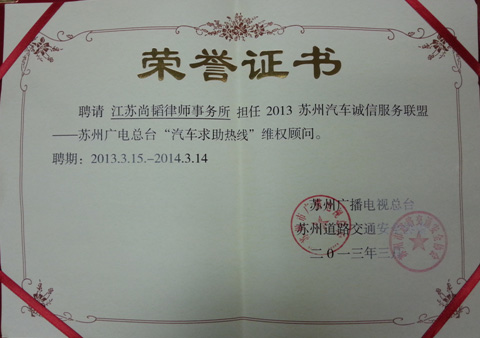 近日,本所合伙人陈璐磊律师及周宁律师代表事务所从苏州广电总台及苏州道路交通安全协会领导手中接过聘书,正式受聘担任由苏州广电总台和苏州道路交通安全协会联合开通的苏州“汽车求助热线”维权法律顾问。