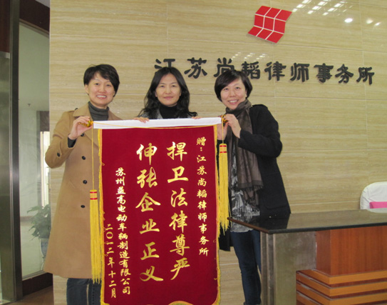 苏州益高电动车辆制造有限公司为感谢本所律师团队多年来为其公司提供的良好法律服务,专程派代表赴本所呈送锦旗。