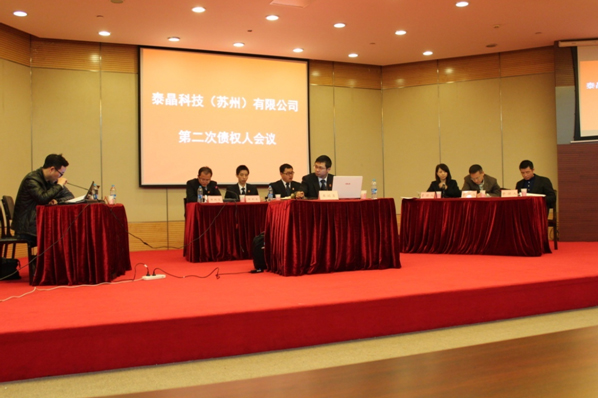 2015年1月22日下午2点,泰晶科技(苏州)有限公司第二次债权人会议在苏州大学独墅湖校区炳麟图书馆召开,本次债权人会议由苏州工业园区人民法院主持,共有140家债权人参加。本所作为泰晶科技(苏州)有限公司破产管理人向债权人会议作了管理人工作报告,并提交了《债权审定表》供债权人会议核查,评估机构以及审计机构分别对评估报告和审计报告作了编制说明。本次债权人会议表决通过了管理人提交的《债权人委员会议事规则》、《债权人委员会成员更换及增选方案》及第一个《财产变价方案》。本次债权人会议顺利完成了全部议程,取得圆满成功。
